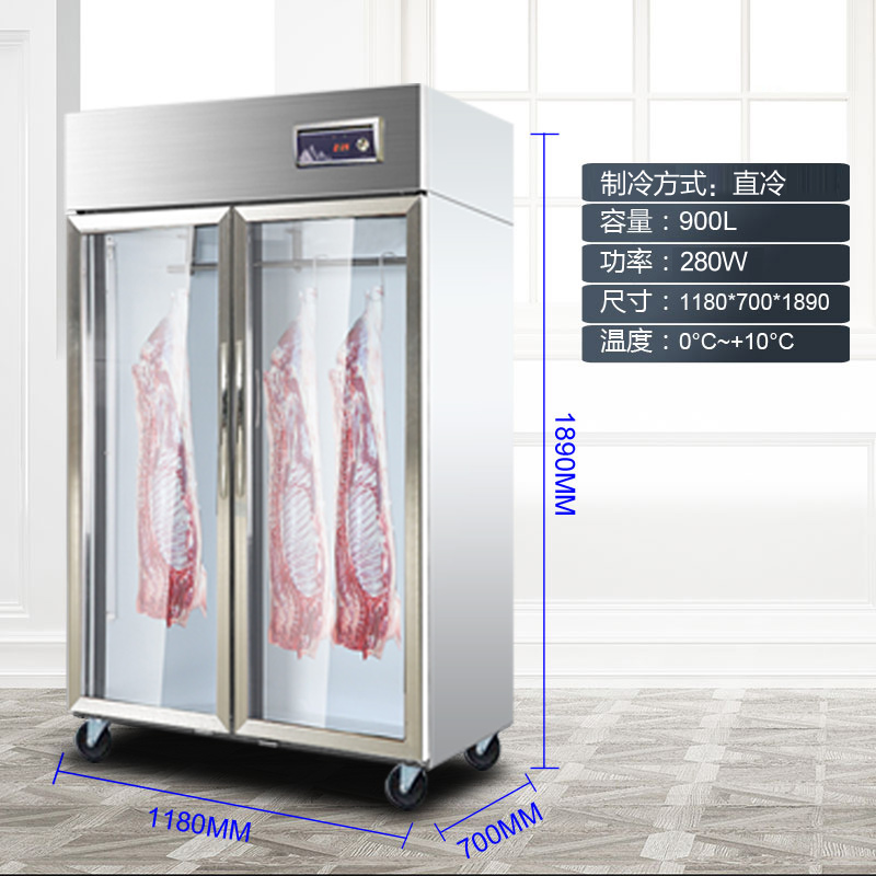 A meat hanging refrigerator is a refrigerated unit used for storing and displaying raw meat products in a retail or commercial setting. It is designed to maintain a temperature between 0°C to 10°C, which is ideal for preserving the freshness and quality of meat products. The unit typically features transparent glass doors, interior lighting, and adjustable shelving to allow for easy viewing and access to the contents.